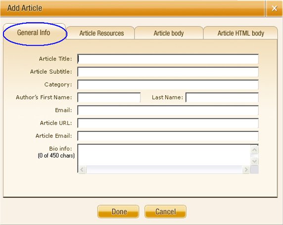 Add article - This option allows you to add a new article. When you click Add Article button, you will see various tabs, where you are required to fill the article information required by the article directory you are about to submit to. Below, you will see an explanation for each of these tabs. |