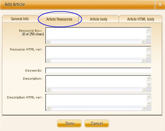 Article Resource Tab: This tab allows you to enter information about the article resource in the Resource Box, resource information for HTML version, a brief description of your article, brief description HTML version, as well as some keywords that relate to your article. The Resource Box has a maximum limit of 250 characters. In many cases, the information entered in this tab is what will be used by the article directories’ visitors to help find the types of articles they are searching for. |