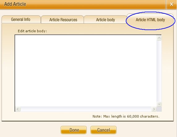 Article HTML Body Tab: This tab works identically to the Article Body Tab discussed above. The only difference is that you are required to enter HTML formatted article into this text box. If you don’t know HTML, don’t be too concerned. You can simply input the same text into the Article HTML Body Tab as you did into the Article Body Tab, and that will work just fine. |