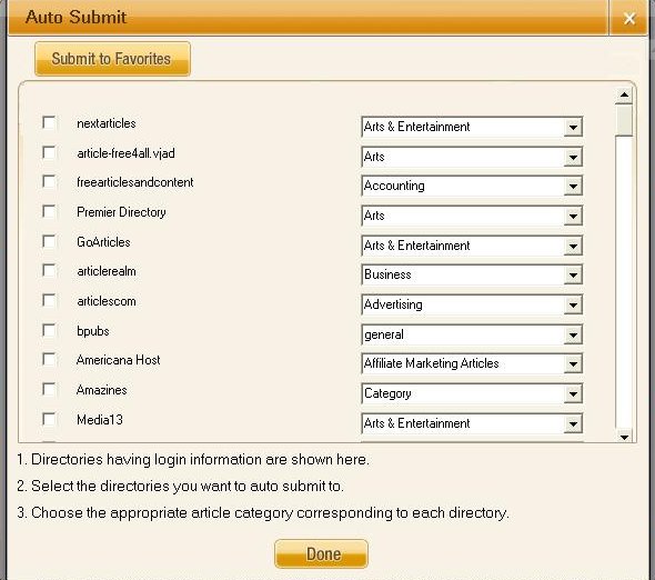 Submit to Favorites button enable users to submit article to all those directories which have been marked as favorites just by a single click. |