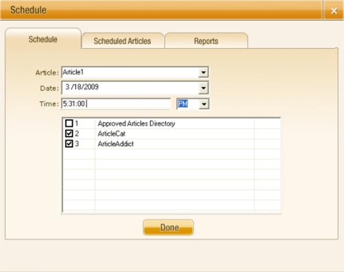 Scheduling: It allows you to specify the following features while scheduling an article. Click 'Done' to go to next option. The scheduling allows you to specify the following for a selected article: